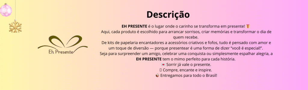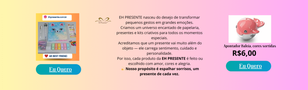 A Eh Presente nasceu para transformar pequenos momentos em grandes lembranças. Aqui, cada produto é criado com carinho, beleza e personalidade — desde cadernos exclusivos até combos completos de papelaria, pensados para quem ama organização, criatividade e um toque de fofura no dia a dia. Trabalhamos com itens selecionados, embalagens especiais e detalhes que fazem toda a diferença. Queremos que você sinta alegria ao abrir cada encomenda e ainda mais felicidade ao presentear alguém que ama. Na Eh Presente, cada produto tem uma história. Cada combo tem uma alma. Cada detalhe foi feito para surpreender. ✨ Presentes que encantam. Papelaria que inspira. Detalhes que transformam.